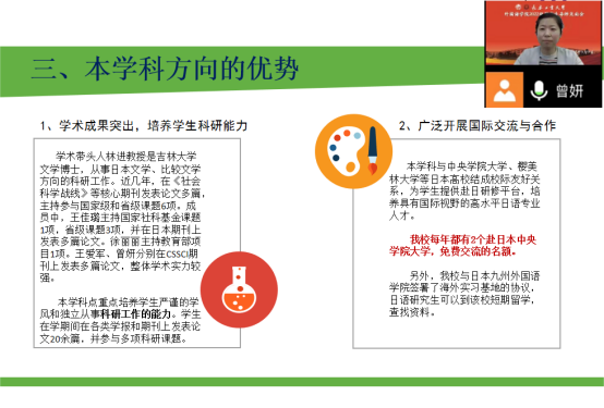 然后,从师资力量、学科简介、本学科方向的优势、学生就业和研究生培养这五个方面,对日语语言文学专业进行了详细地讲解,对研究方向、课程设置、研究生培养方案等进行了清晰地解读。最后,与研究生们进行了亲切地交流,解答同学们有关研究生学习生活方面的疑问。日语语言文学专业入学教育活动圆满完成。