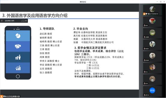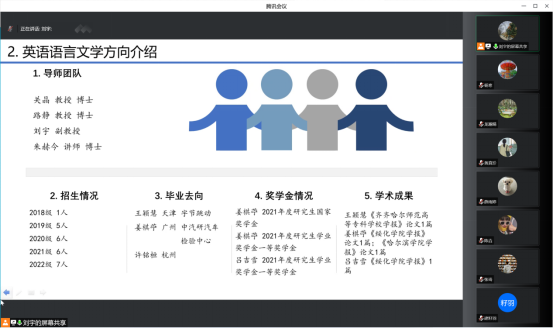 概况、英语专业的发展历程和取得的成果。全面地介绍了这两个方向的导师团队、近年的招生情况、毕业去向、奖学金评定规则,并讲解了个人培养计划,让同学们明晰培养目标和课程安排。在师生互动环节,详细解答了同学们的疑问,拉近了师生之间的距离。
