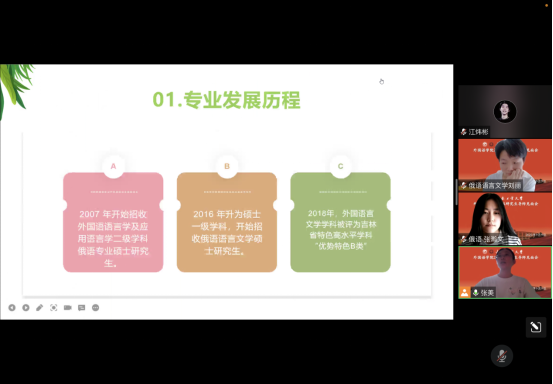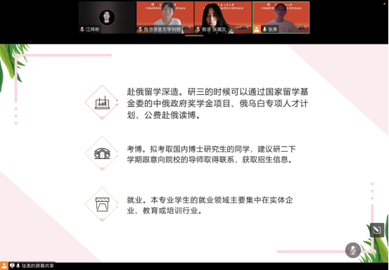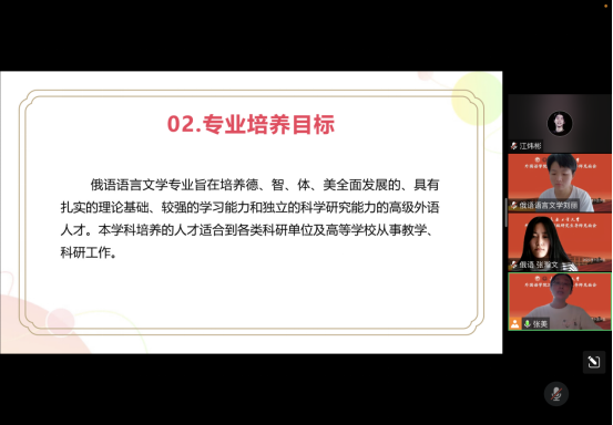 和俄语语言文学专业的发展历程,全面地讲解了专业人才培养目标和培养过程、课程学习方式、毕业论文的撰写和学术要求。然后分析了毕业生的就业现状,对毕业后是继续深造还是就业等问题进行了解答,并叮嘱同学们要明确自己的学习目标,做好生涯规划。最后,她与2022级新生就如何更好地学习、找到感兴趣的研究方向,进行了交流讨论。