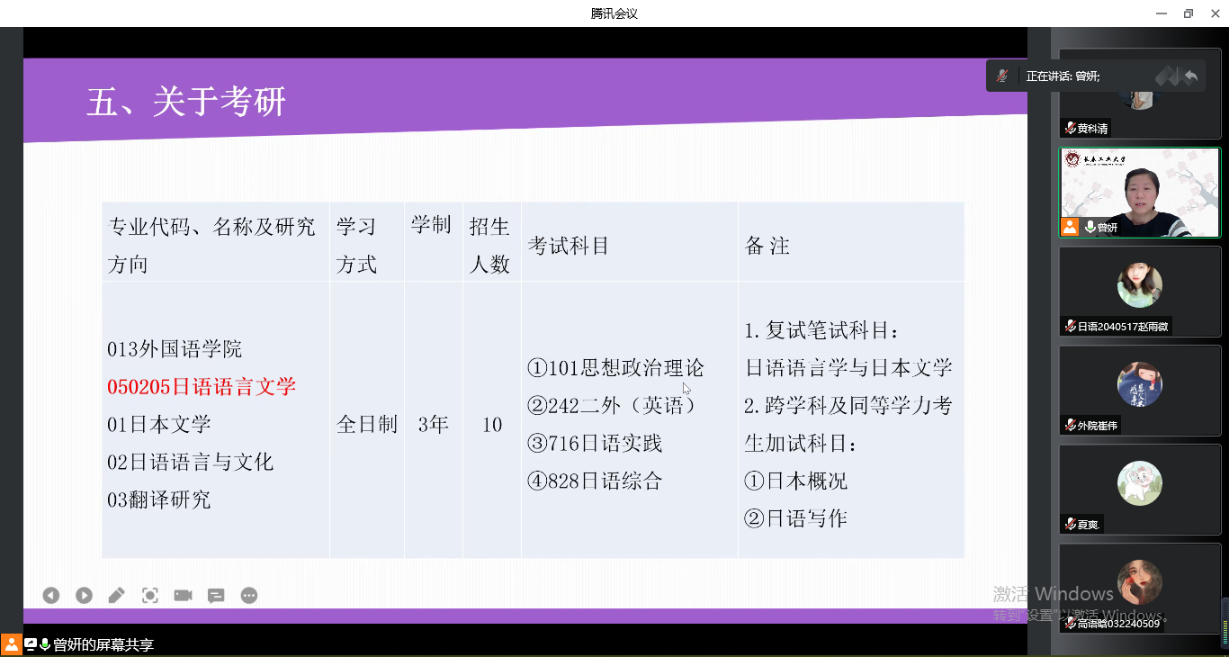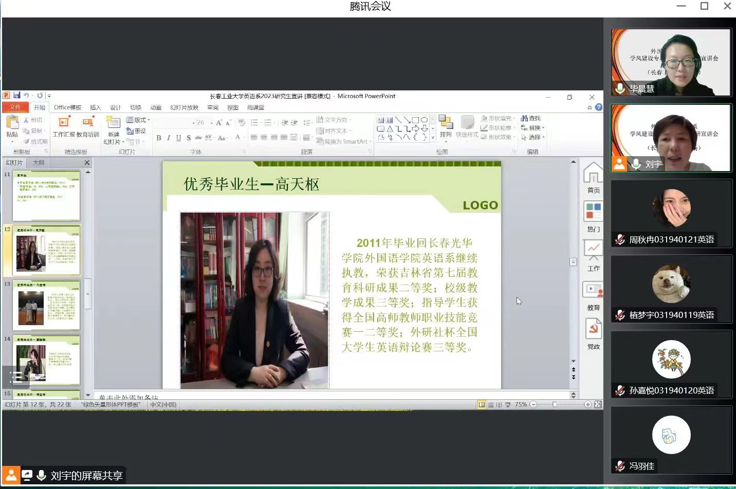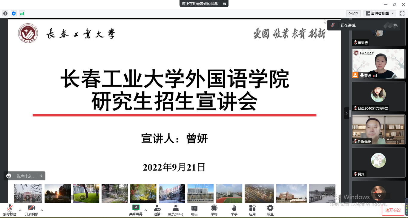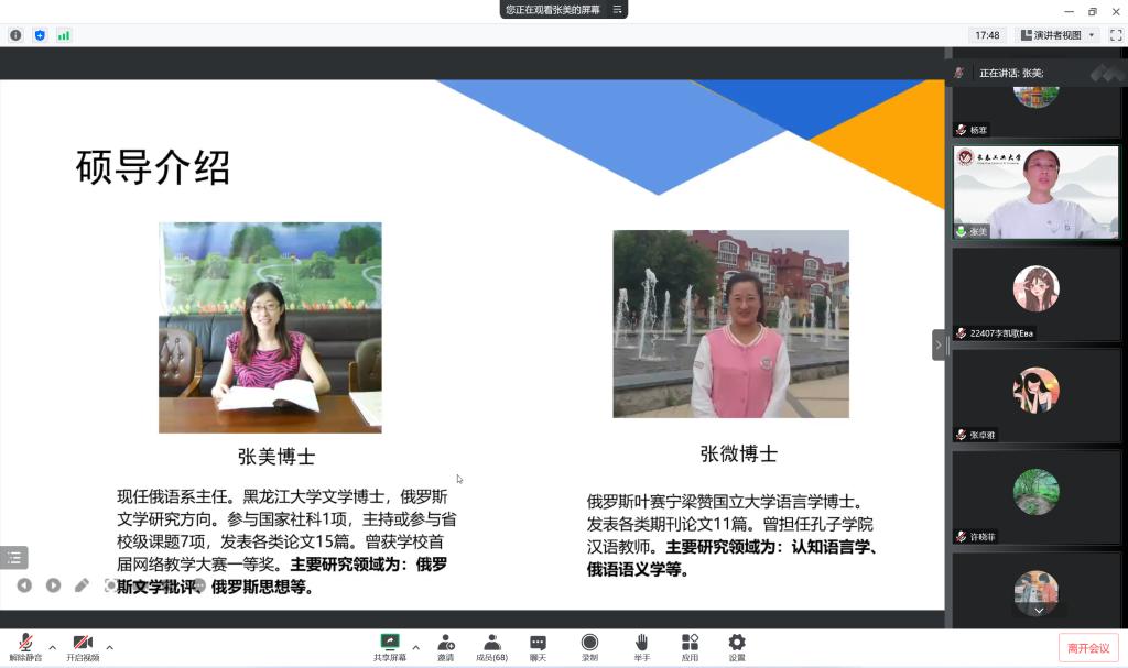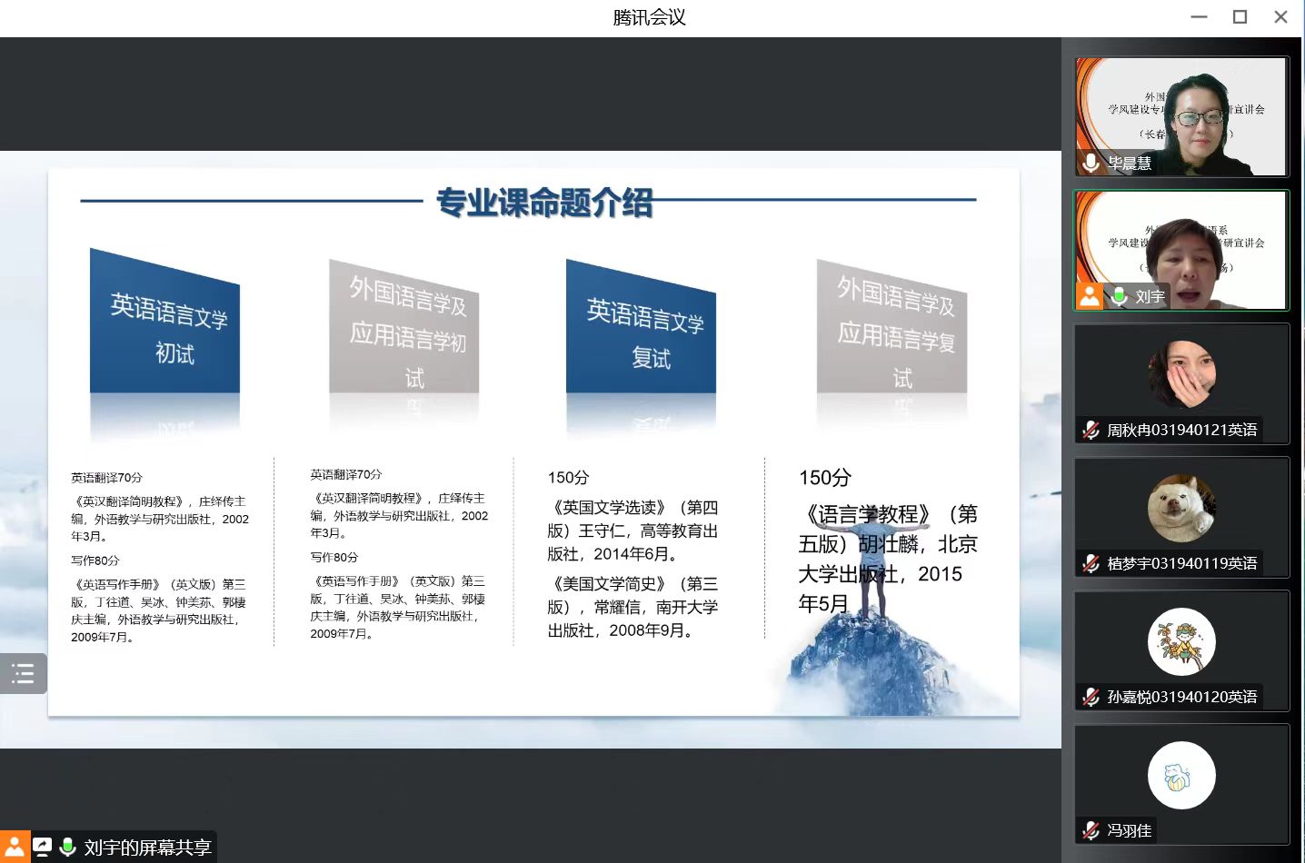 英语系主任毕晨慧、日语系主任崔伟和俄语系主任许晓菲分别主持三个专业的线上会议,19、20、21级学生参加了本次宣讲会。