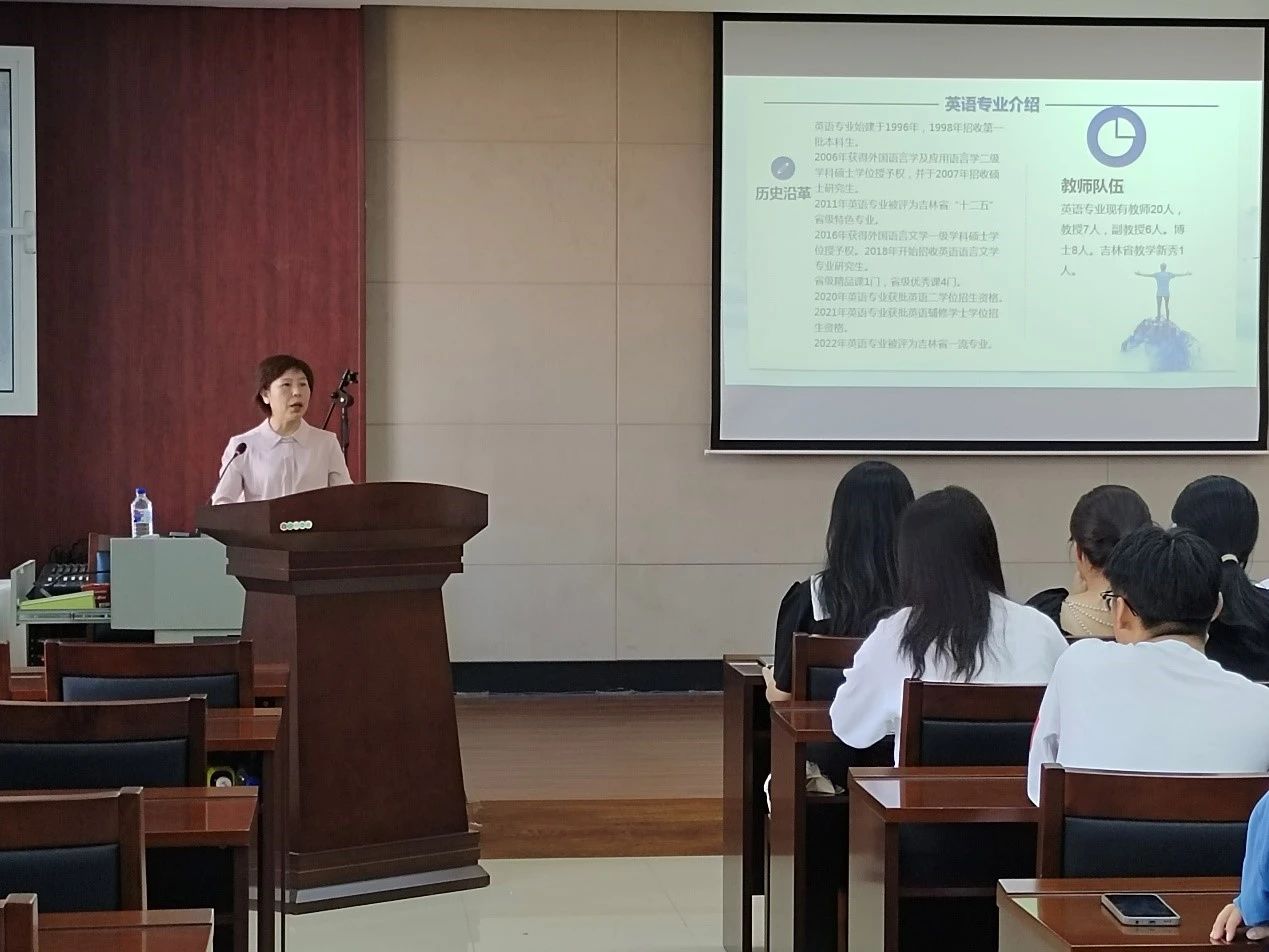 英语专业由英语系主任刘宇进行介绍。首先,她代表英语专业所有老师对2023级新生的到来表示热烈的欢迎。随后详细地为同学们讲解英语专业国内外现状及发展趋势、人才培养方案、毕业及授予学位要求及未来就业方向的同时,也对历年专业四级、专业八级考试及考研情况进行了介绍。除此之外,老师还通过精彩的图片向大家展示了皇冠现金游戏网