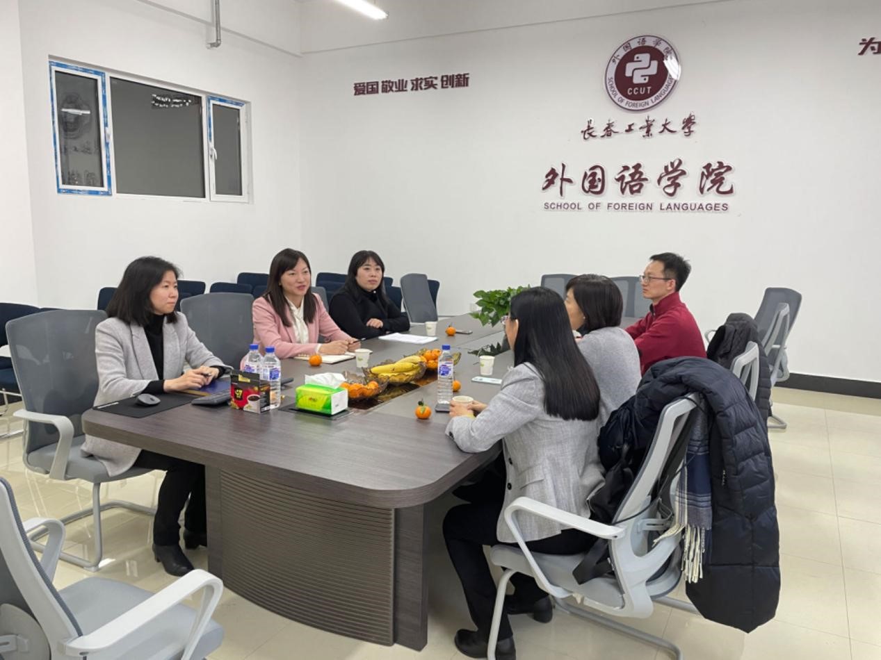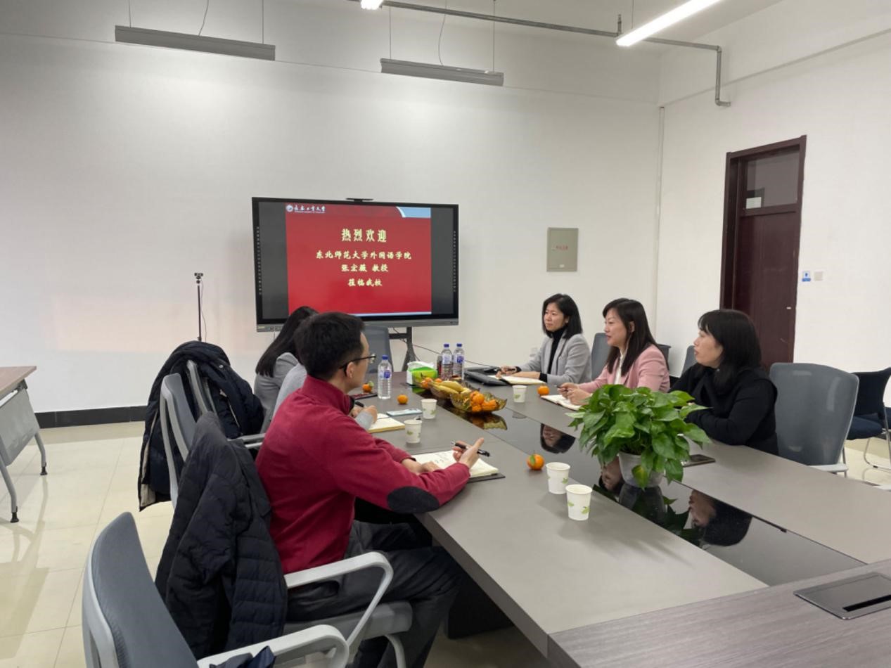 院长王轶,副院长李秀文、曾妍,英语系主任刘宇和部分英语系教师与张宏薇教授就翻译硕士专业学位授权点的申报工作进行了深入的交流和讨论。张教授从申报材料的撰写、翻译硕士的学科建设、翻译实践基地的选择以及未来翻译硕士点的评估工作等四个方面给予了宝贵意见。张教授的耐心指导令在场的教师们受益匪浅,并对未来的工作充满了信心与动力。