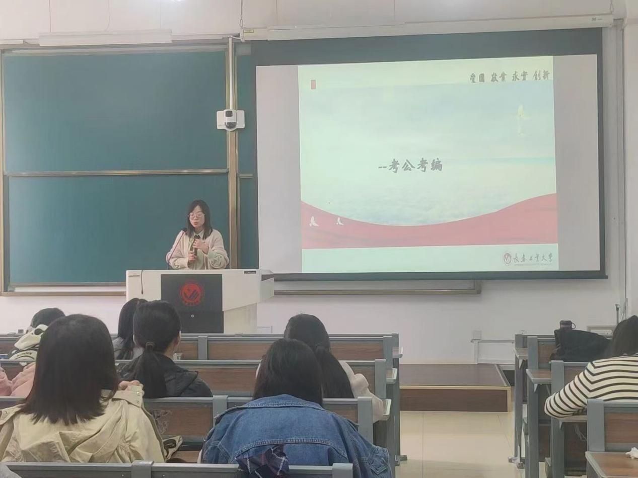 专职组织员、2025届毕业班辅导员谭密分析了目前学生的就业方向及相关注意事项。她指出,要树立正确的就业观念,积极适应当前社会多元化就业的新常态,不论是在职场上继续拼搏还是继续深造,不论是考公还是考编,都需要保持一颗学习的心。
