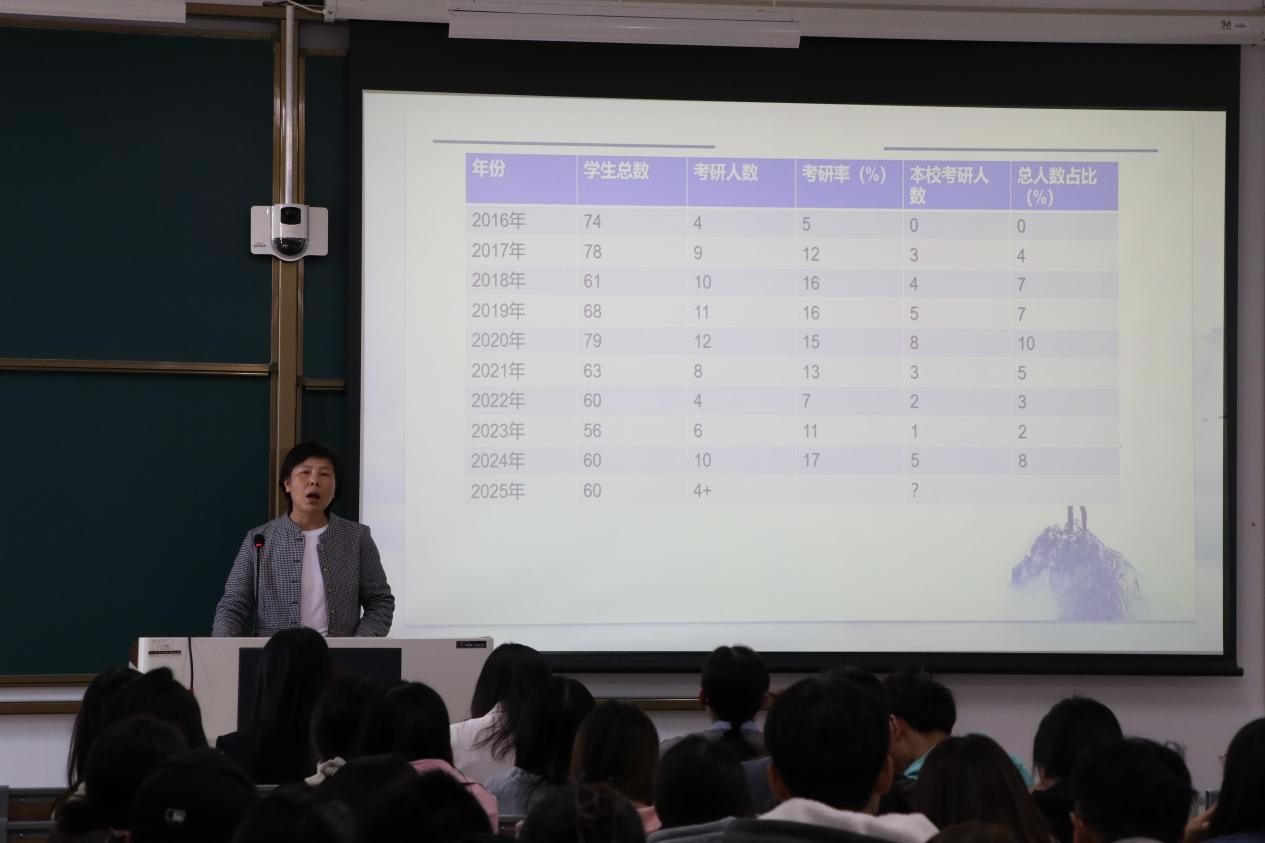 高度重视毕业生的考研及就业工作,重点给同学们分析了专硕与学硕的区别、一志愿考生与调剂考生的不同以及明年考研形势的变化,鼓励同学们积极应对未来的机遇与挑战。她进一步强调,考研是对一个人在学术和人生方面的提升机会,应该努力把握;就业不仅是学生个人的责任,更是其事业发展的关键环节,应该努力学习科学文化知识,树立正确的人生观、价值观以及积极的就业观。明确人生目标并为之奋斗,要敢于面对人生的挑战。