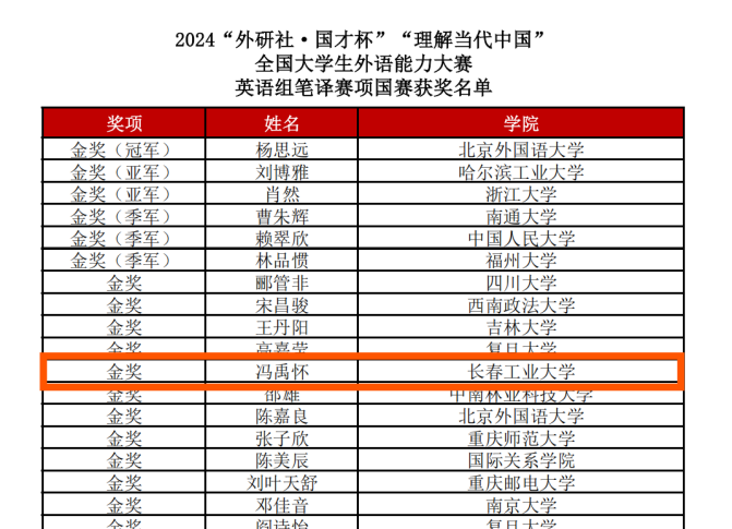 学生冯禹怀入围英语组笔译比赛国赛,并最终取得了国家级金奖的好成绩。这是我校在该项赛事中取得的最好成绩。