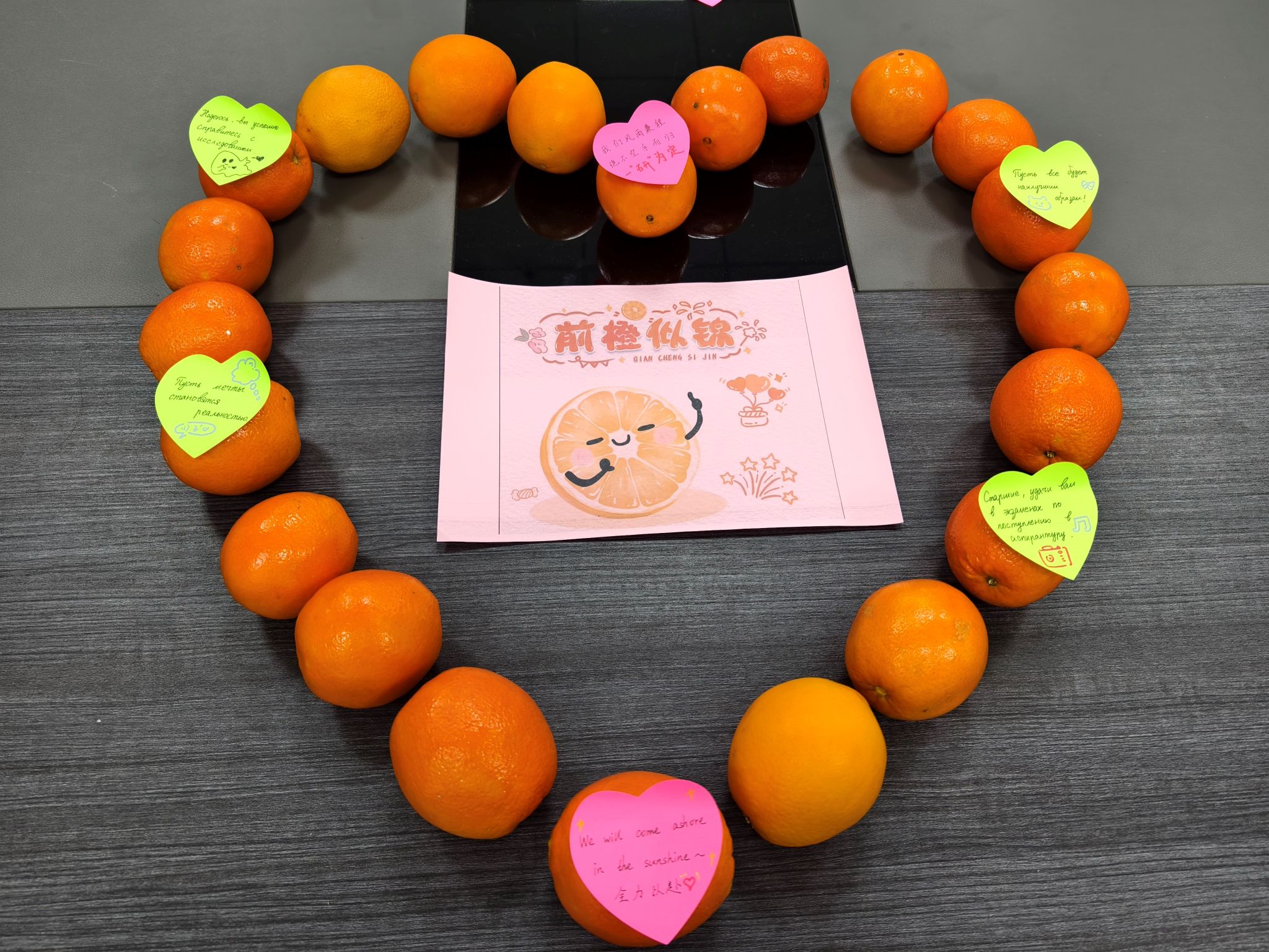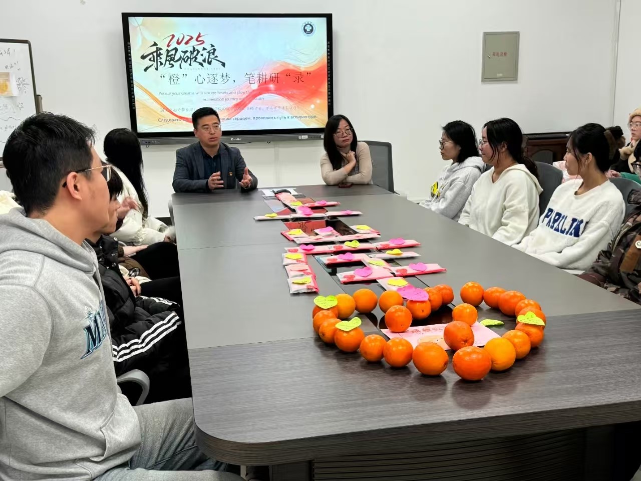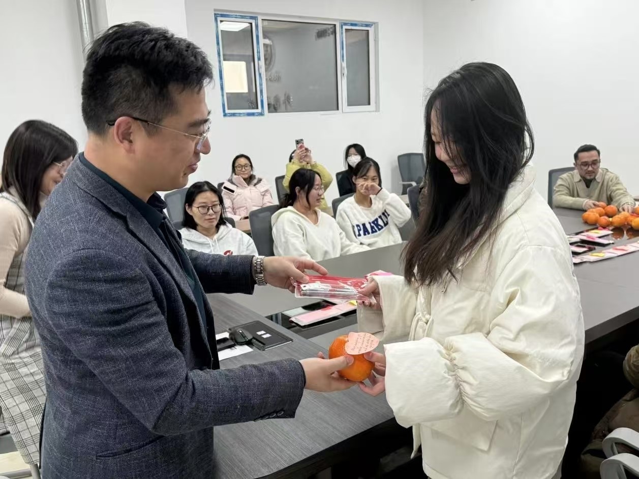 党委,为考研学生代表送上橙子和文具袋,寓意“橙”心逐梦、笔耕研“录”。希望同学们在品尝橙子甘甜的同时,能坚定心中的信念,在考场上执笔乘风,收获成功的果实。
