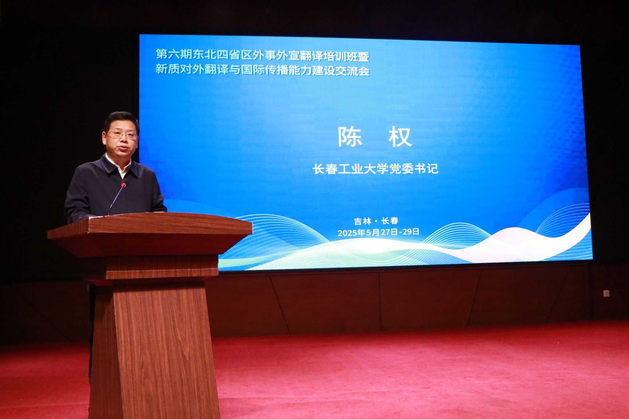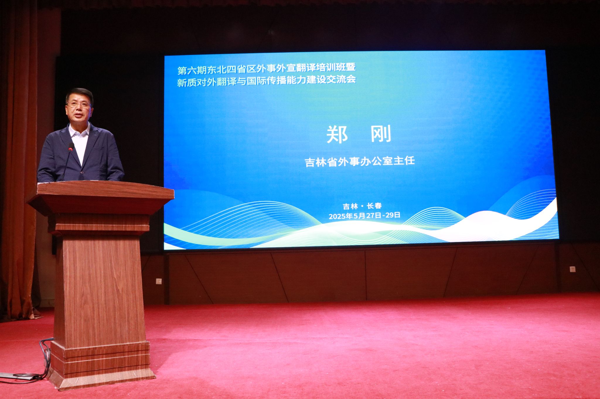 吉林省外事办公室主任郑刚在会上致辞,对我校等承办单位表示感谢,指出,外事外宣和翻译工作作为跨文化交流的重要桥梁,是提升新质对外翻译与国际传播能力的实践主体,做好外事外宣和翻译工作正当其时、大有可为。并希望学员们珍惜学习机会,提升专业素养;加强交流互动,促进共同进步;学以致用,推动事业发展。