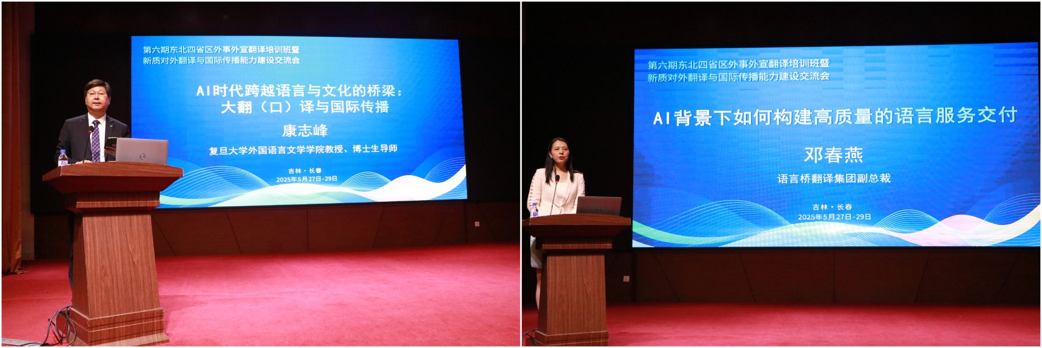 康志峰教授作了题为《AI时代跨越语言与文化的桥梁:大翻(口)译与国际传播》的主旨报告。语言桥翻译集团副总裁邓春燕作了题为《AI背景下如何构建高质量的语言服务交付》的主旨报告。