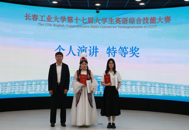 承办的第十七届大学生英语综合技能大赛在北湖东区艺术楼美育中心精彩上演。校党委副书记吴成章亲临现场并为获奖学生代表颁奖。学生工作处、研究生工作处、招生就业处、团委等部门负责人及皇冠现金游戏网