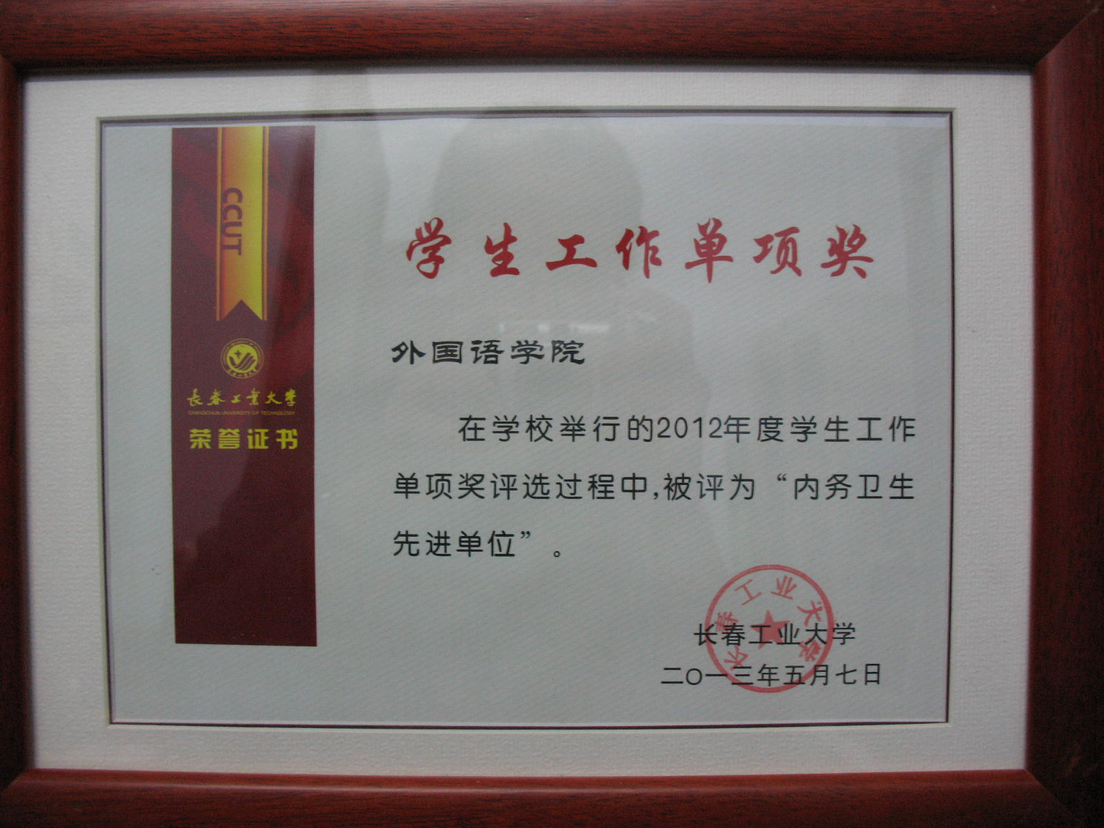 在学校2012年度学生工作单项评选中,被评为“内务卫生先进单位” 2013年6月皇冠现金游戏网