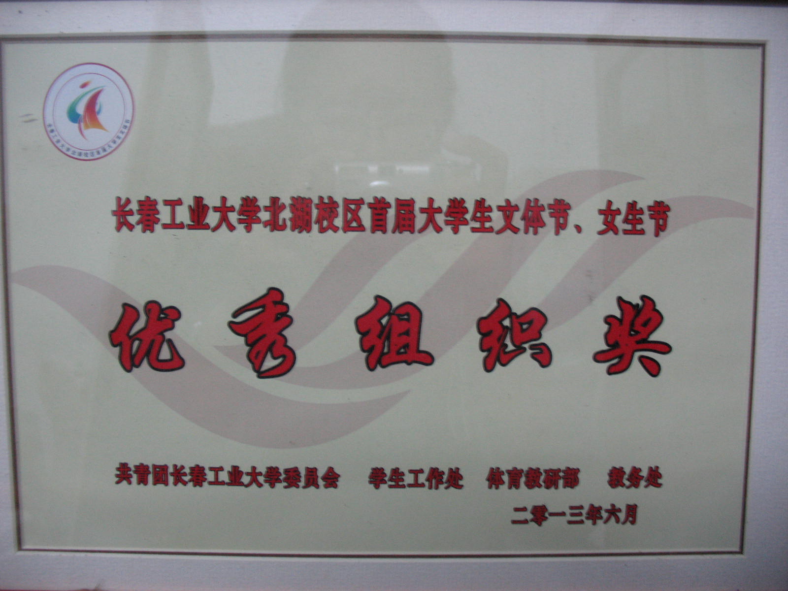 在长春工业大学北湖校区首届大学生文体节、女生节中获得“优秀组织奖”