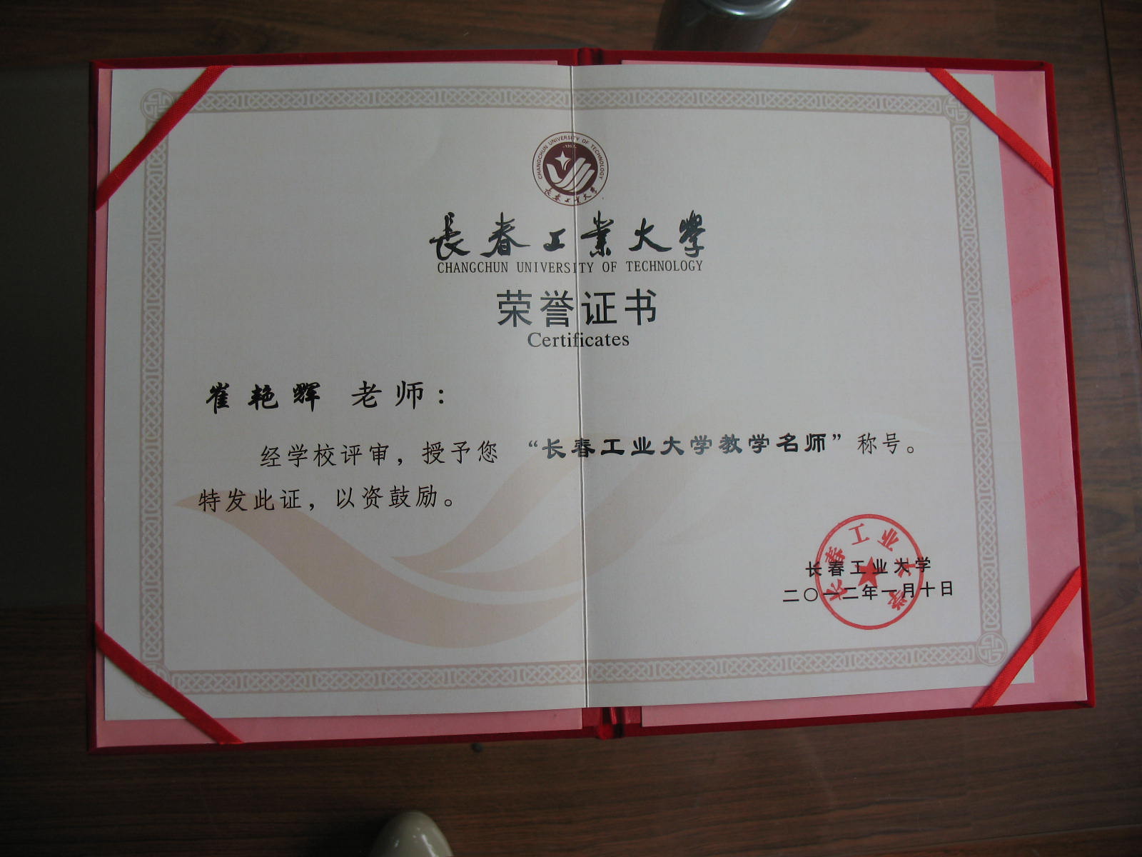 崔艳辉老师获得“长春工业大学教学名师”称号 2009年3月皇冠现金游戏网