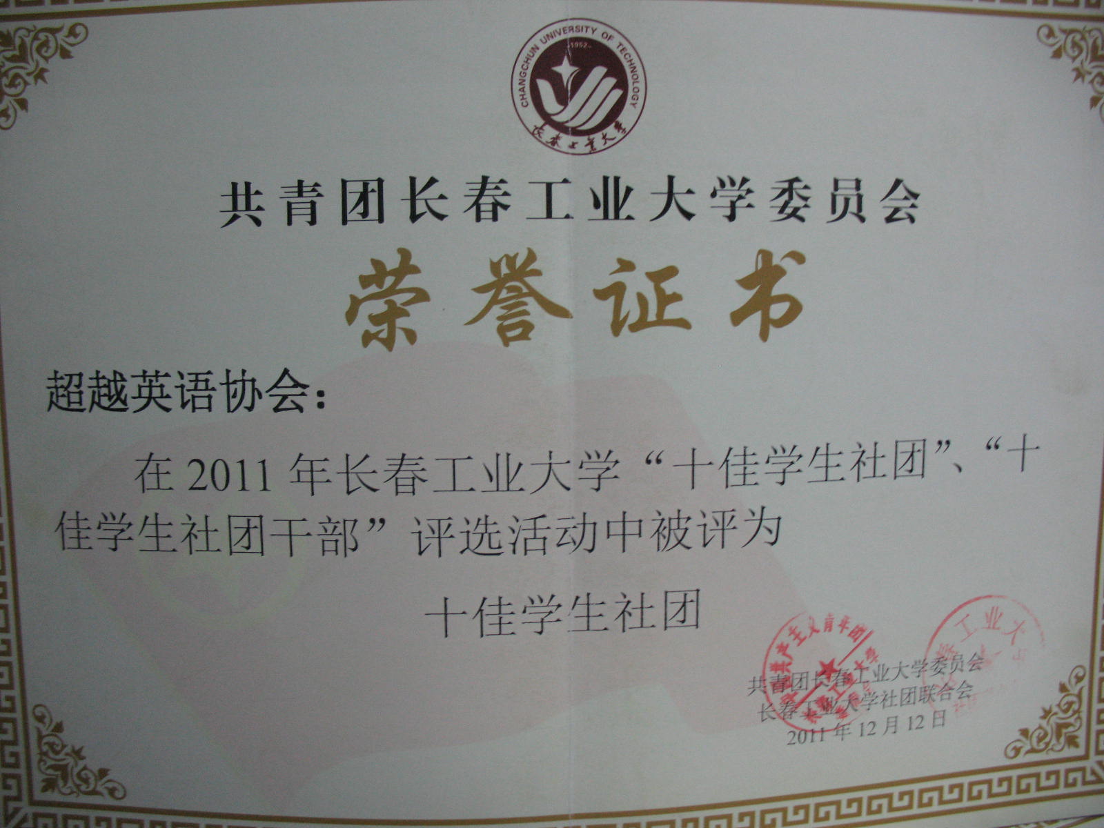 2011年12月12日超越英语协会在2011年长春工业大学“十佳学生社团”、“十佳学生社团干部”评选中获得“十佳学生社团”称号