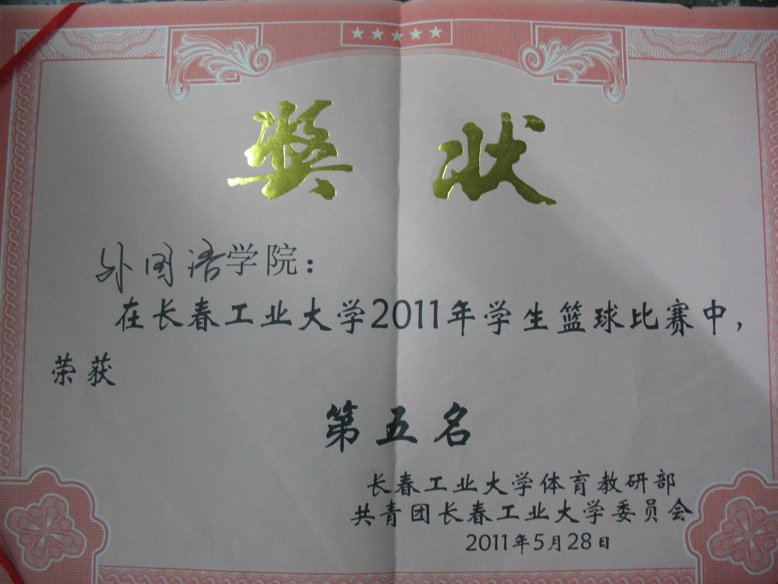 在长春工业大学2011年学生篮球比赛中获得第五名。