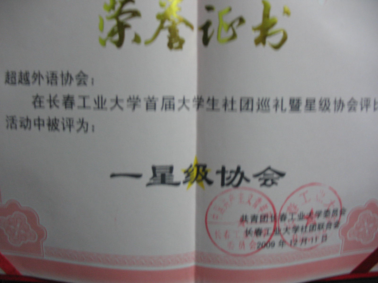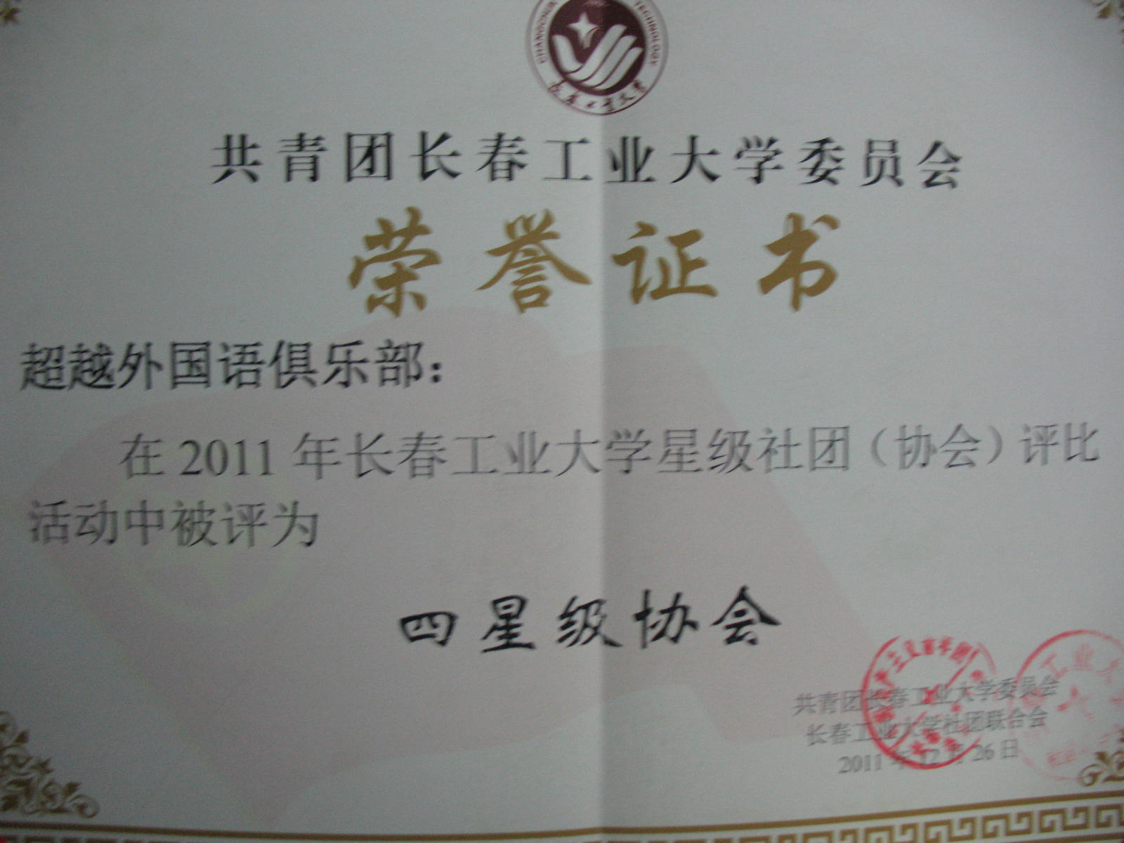 2011年12月26日超越英语俱乐部在2011年长春工业大学星级社团(协会)评比中获得“四星级协会”称号
