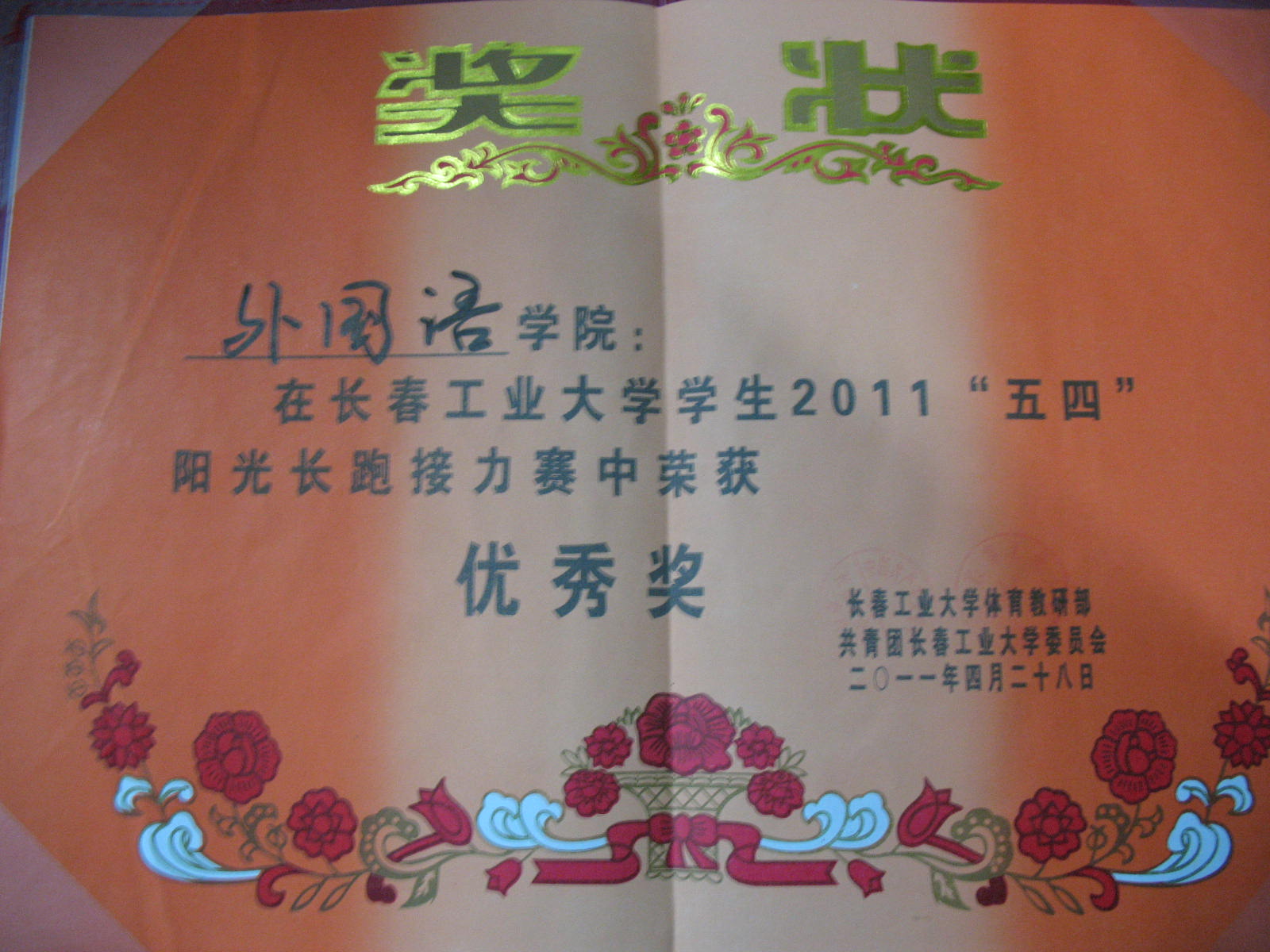 再长春工业大学学生2011“五四”阳光长跑接力赛中荣获“优秀奖”。