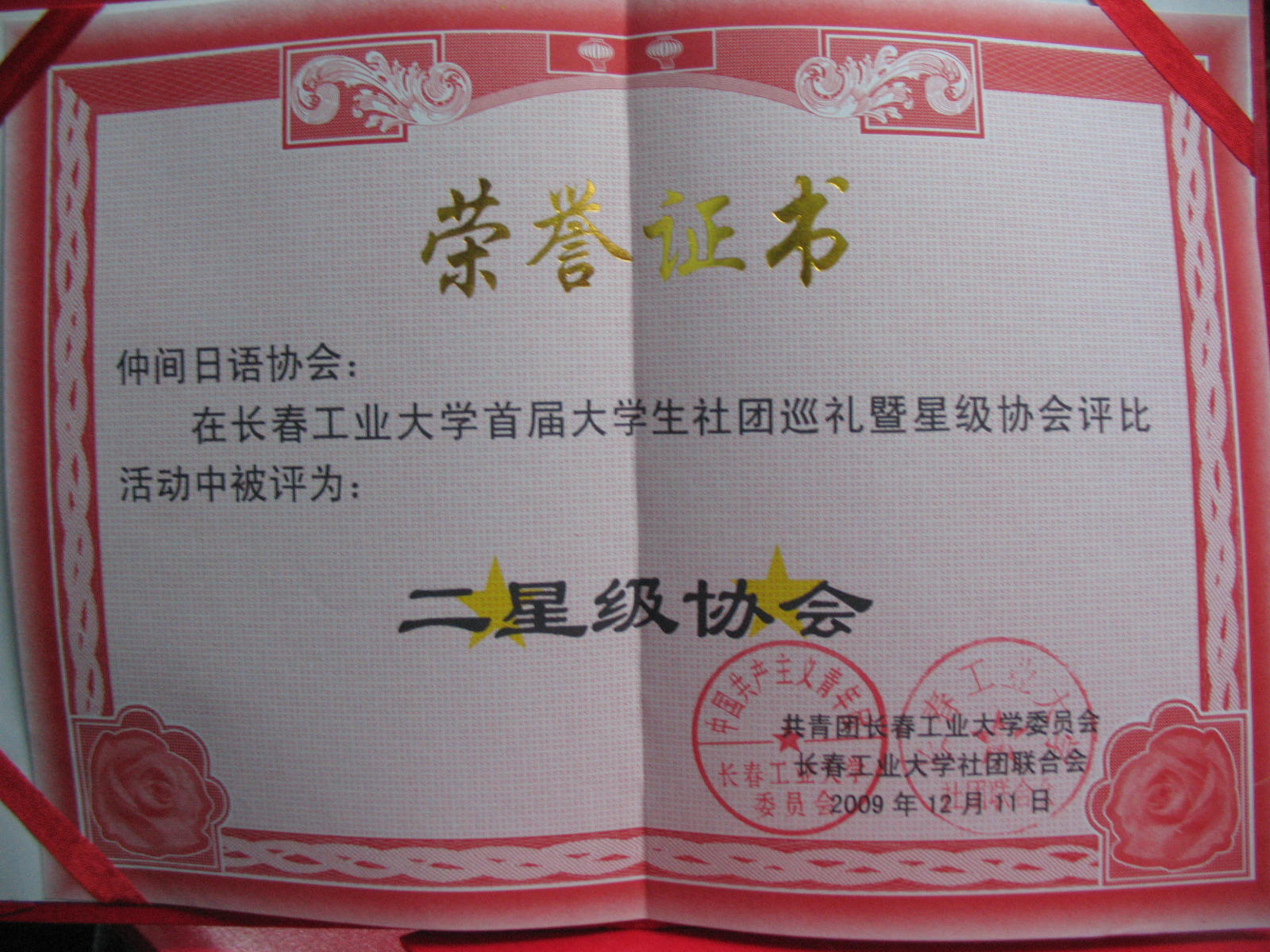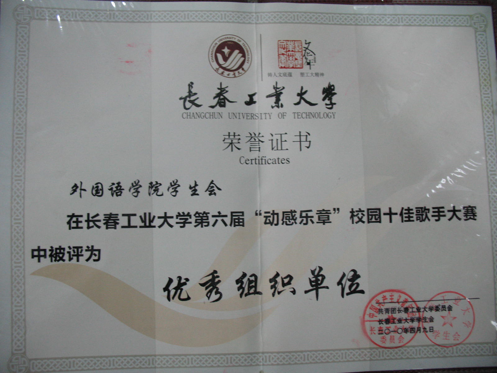 在首届长春工业大学社团联合会星级协会评选活动中被评 为优秀组织单位 |