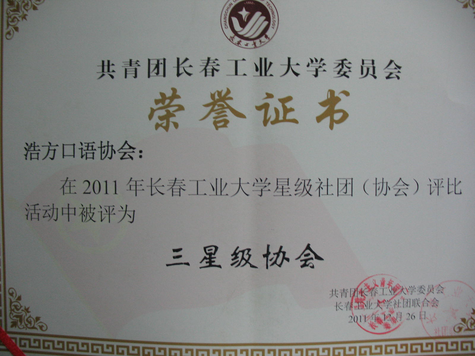 2011年12月26日浩方口语协会在2011年长春工业大学星级社团(协会)评比中获得“三星级协会”称号