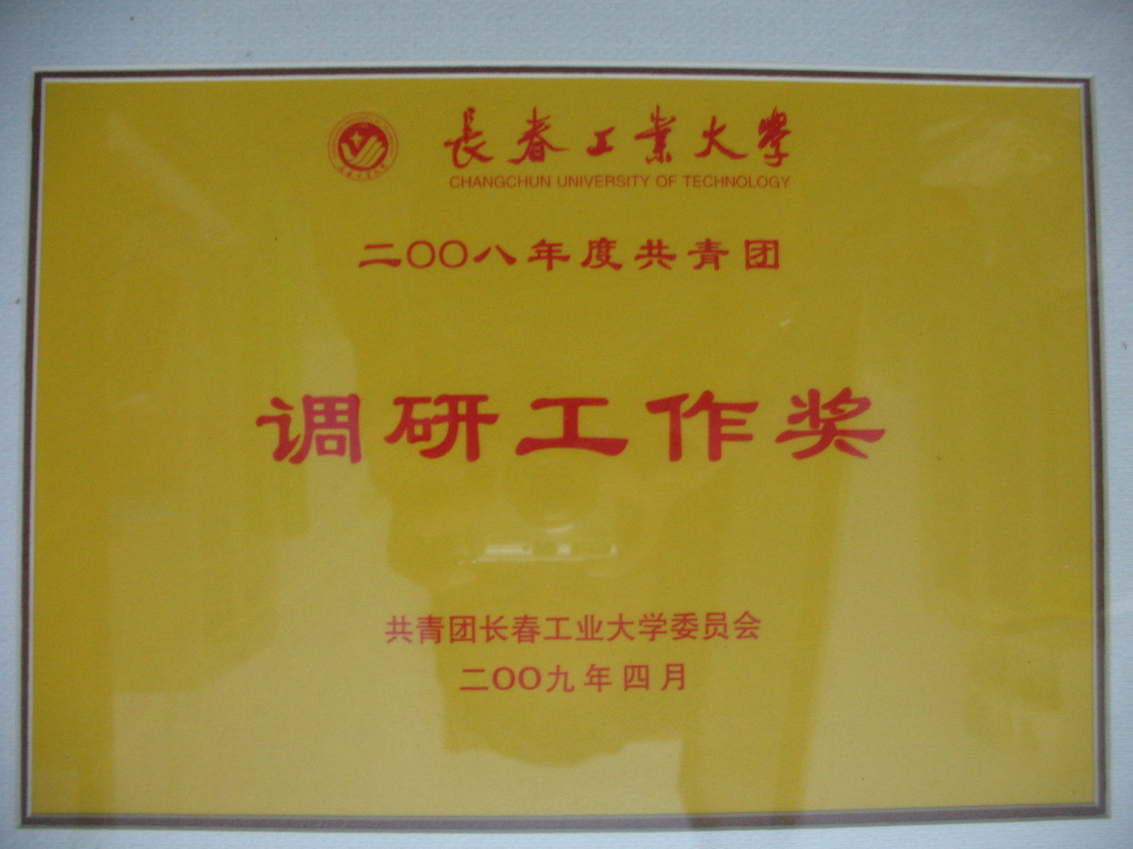 获得2007年度长春工业大学共青团“调研工作奖”。