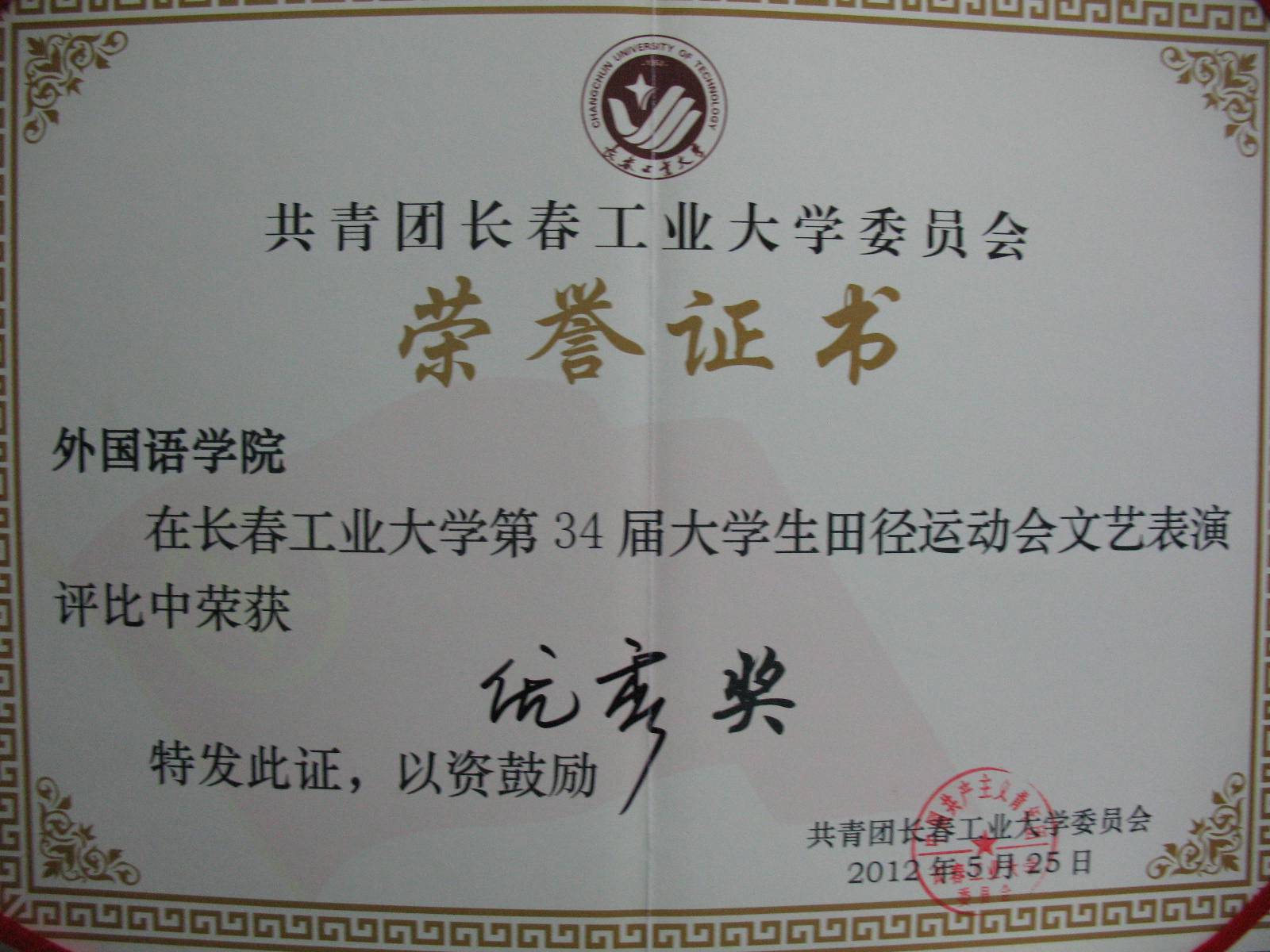 获得长春工业大学第三十四届田径运动会文艺表演“优秀奖”。