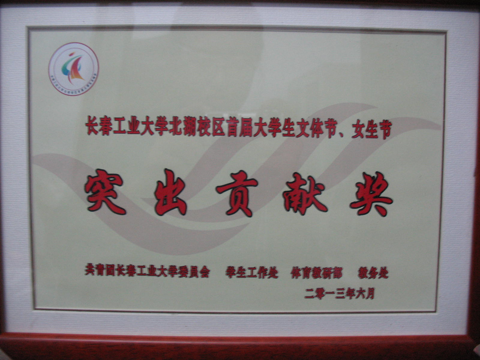 获得长春工业大学北湖校区首届大学生文体节,女生节“突出贡献奖”。