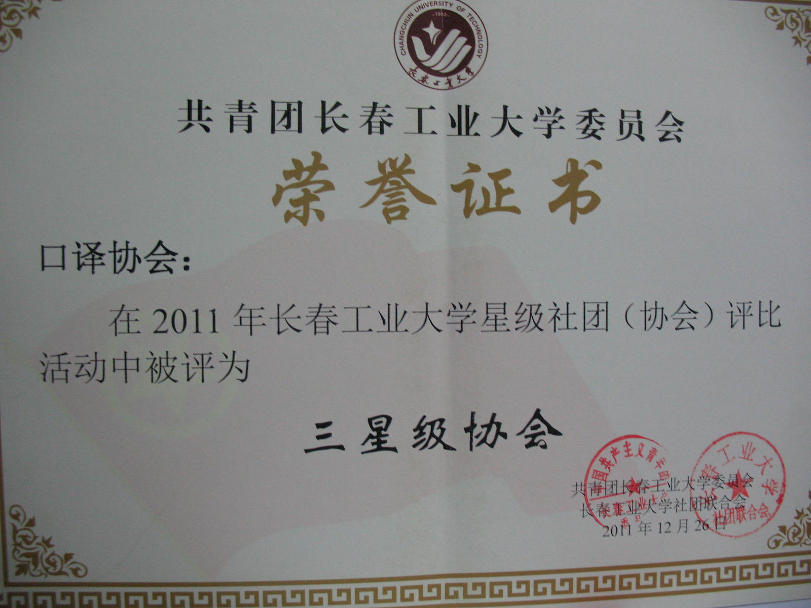 学生会获得第六届“动感乐章”校园十佳歌手大赛“优秀组织单位”。 2011年12月26日口译协会在2011年长春工业大学星级社团(协会)评比中获得“三星级协会”称号