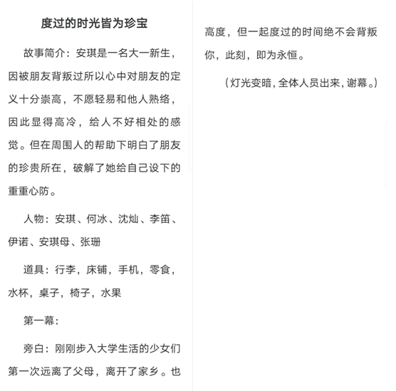 “学姐制”朋辈心理辅导站组织全体同学参加了校心理中心组织的心理剧大赛,各班认真准备,团结写作,用最饱满的热情创作出了 181001班题目《重生》、181004班题目《头顶阳光心向太阳》、191001班题目《800米的距离》、191004班题目《渴望》、191005班题目《度过的时光皆为珍宝》等优秀的剧本。