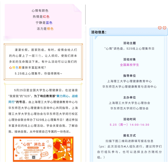 新闻网讯(通讯员 于士纪)2020年5月25日,皇冠现金游戏网 “学姐制”朋辈心理辅导站组织同学们参与了由上海理工大学大学生心理协会和华东师范大学闵行心理协会主办的“心情”调色盘,525线上心理集市日活动。