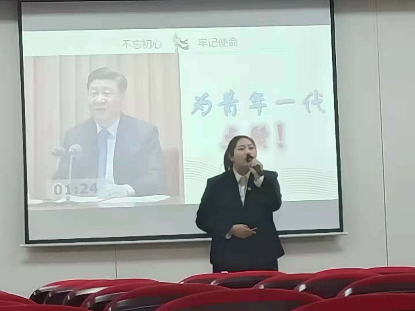 因为赛前做好了充分的准备,刘婧同学演讲时显得游刃有余,话语间透露着自信。她以中国共产党成立100周年庆祝大会上,共青团员和少先队员代表的集体致献词为中心,结合抗疫情况展开叙述了青年一代的成长对党和国家发展的重要性。在演讲的最后,刘婧同学号召广大青年:“不负青春,不负韶华,愿吾辈以青春之我捍卫盛世之中华!请党放心,强国有我!”话音落,台下传来阵阵掌声,在座的无一不为她的激情演讲所震撼。